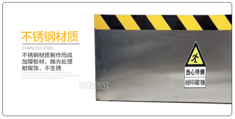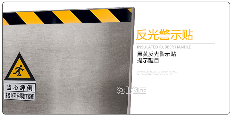 不銹鋼擋鼠板采用不銹鋼板材制做。擋鼠板上部貼黃黑相間反光條,反光條為反光膜加背膠紙制作。